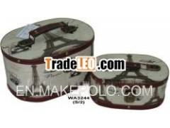 This wooden hat box is made from wood and printig CanvasThese nestingoval boxes is made of mdf and canvas, with lininginside. Veryretro and classy all in one storage for your home oroffice.
