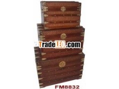 These storage trunks aresolid and very sturdy. They''re useful as storage in any roomof the home . they''re made from maple plywood and firsolidwood with brown finish .outside covered withrattan.